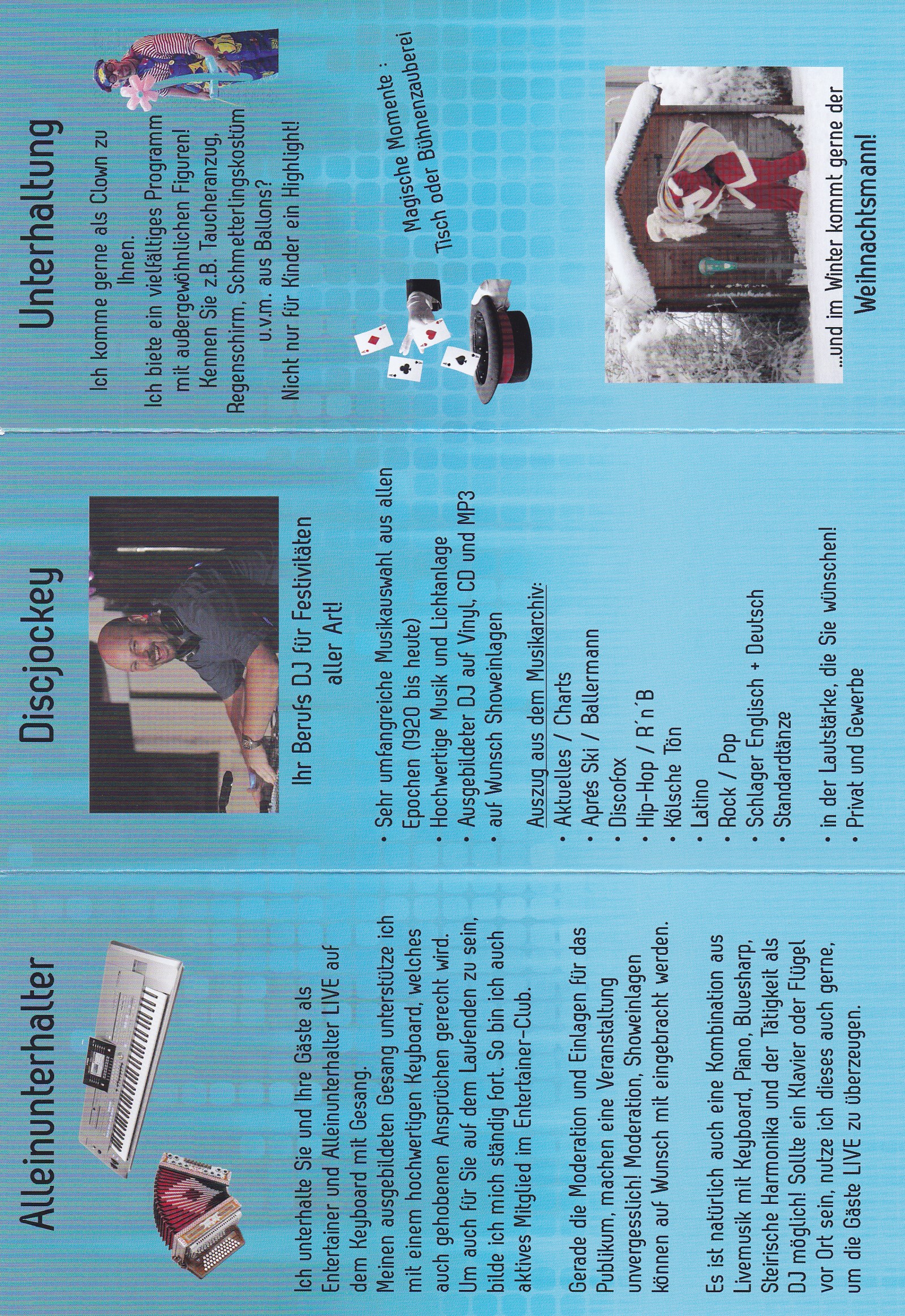 🎶 Musikvielfalt: Von aktuellen Charts über 70er, 80er, 90er, Rock, Schlager (deusch/englisch), Discofox, kölsche Lieder, Volksmusik aus den Alpen, Ballermann bis zu Partykrachern – ich habe für jeden Geschmack den passenden Sound im Repertoire.